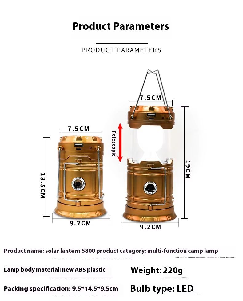 Lanterna de acampamento com ventilador externo, carregamento solar, LED, barraca de acampamento, lâmpada extensível portátil multifuncional